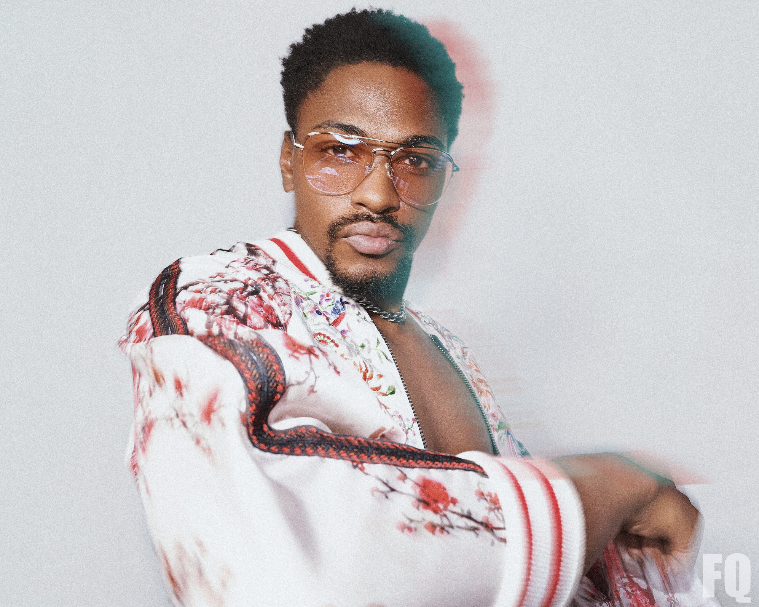 Photograph By BRAD EVERETT YOUNG / Necklace by @Vitaly VitalyDesign.com / Sunglasses by PRIVÉ REVAUX priverevaux.com / Blossom print jacket w/ flared sleeves by @OTT byott.com / OTT Appears courtesy of Maison Privée